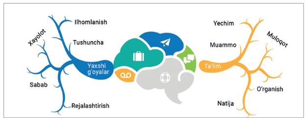 2. oʻquvchilar ushbu soʻz bilan bogʻliq xayolga kelgan soʻz va jumlalarni uni atrofiga yoza boshlaydilar.