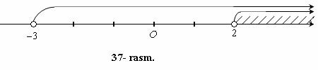Birinchi tengsizlikning yechimlari x > 2 nurning barcha nuqtalari, ikkinchi tengsizlikning yechimlari x > –3 nurning barcha nuqtalari bo`ladi (37- rasm).