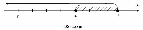 Son o`qida (2) sistemaning birinchi va ikkinchi tengsizliklarining yechimlari to`plamini tasvirlaymiz. Birinchi tengsizlikning yechimlari x ≥ 7 nur, ikkinchi tengsizlikning yechimlari x ≤ 4 nur bo`ladi (38- rasm).