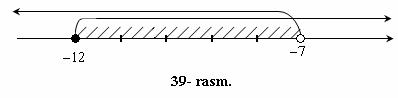 Son o`qida x ≥ –12 va x < –7 nurlarni tasvirlaymiz (39- rasm). Rasmdan ko`rinib turibdiki, bu nurlarning umumiy nuqtalari to`plami [–12; –7) yarim interval iborat.