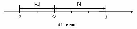 Son o`qida, masalan, 3 va 2 nuqtalarni tasvirlaymiz (41- rasm). Rasmdan ko`rinib turibdiki, |3| = 3 bu 0 nuqtadan 3 nuqtagacha bo`lgan masofa, |2| = 2 bu 0 nuqtadan 2 nuqtagacha bo`lgan masofa.