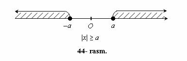 Bu tengsizlikni 0 nuqtadan a dan kichik bo`lmagan masofada yotuvchi barcha x nuqtalar to`plami, yani x ≥ a va x ≤ a nurlarning nuqtalari qanoatlantiradi (44- rasm).