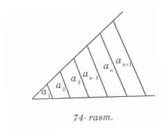 *               5-masala. Burchakning bir tomonida uning uchidan boshlab teng kesmalar ajratiladi. Ularning oxirlaridan parallel to'g'ri chiziqlar o'tkaziladi (74- rasm). Shu to'g'ri chiziqlarning burchak tomonlari orasidagi a1, a2, a3, ... kesmalarining uzunliklari arifmetik progressiya tashkil qilishini isbotlang.